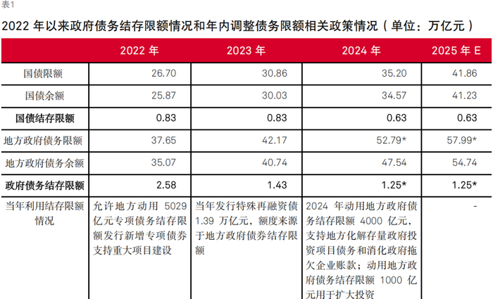 我们预计2025年国债和地方政府债可动用结存限额有限,政府仍可以在年内调增政府债务限额,获得更多政策加码空间。根据预算报告公布的2025年政府债务限额,若当年计划新增政府债务全部发行,截至2025年末,国债余额为41.2万亿元,地方政府债余额为54.7万亿元,与预算报告中的债务限额分别相差0.6万亿元和1.3万亿元,运用结存限额可操作的政策空间有限。但根据近年政府财政政策手段来看,年初预算是政策导向和政策基础,年内仍存在进一步加杠杆的空间。