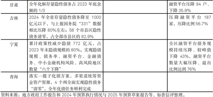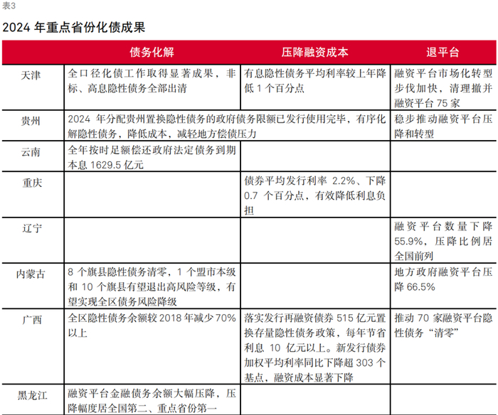 “一揽子化债”推行以来,重点省份债务管理已见成效,“动态调整债务高风险地区名单”政策思路下,中央对地方化债将强化差异化监管,或将出现首批退出重点省份,实现政府投资项目增长。根据各重点省份披露的政府工作报告和地方预算报告(表3),多地取得了阶段性化债成果。此外,宁夏已提及符合退出债务高风险省份的条件,并向国务院提交申请,有望成为首批退出名单的省份。