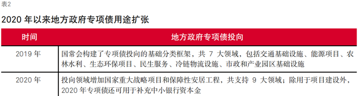 从用途上看,专项债支持领域和用途扩展,项目建设投向领域从传统基建转向多元化领域,提升资金使用效率的同时,强化债务风险化解和支持房地产平稳发展功能,释放了债务工具灵活性。2019年国常会构建了专项债投向的7大基础分类领域后,2020—2024年,专项债资金投向又陆续增至9大领域,并拓宽至2024年的11大领域,具体分项包括新能源,云计算、人工智能等新型基础设施,信息化基础设施,集成电路配套基础设施等。2024年12月25日,国办发文规定,未纳入专项债投向领域“负面清单”的项目均可申请专项债资金,专项债券投向领域由原先的“正面清单”+“负面清单”管理,改为“负面清单”管理。专项债用于项目建设的投向领域逐渐扩大,减少闲置资金,增加资金利用率,让财政政策效果更加显著。