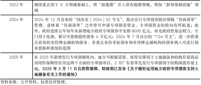 除用于项目建设外,2020年明确了专项债还可用于补充中小银行资本金。2024年批准从新增地方政府专项债券中安排8000亿元额度补充政府性基金财力,专门用于化债;“134号文”则将重点省份的非持牌金融机构债务、非重点省份非标债务和非持牌金融机构的债务纳入可进行债务置换和重组的范围,加大了专项债用于地方化债的政策支持力度。2025年,政府明确在新增发行专项债额度内,地方可根据需要统筹安排用于土地储备和收购存量商品房用作保障性住房。专项债用途从项目建设进一步向强化债务风险化解和支持房地产平稳发展功能拓展,从而促进经济发展。