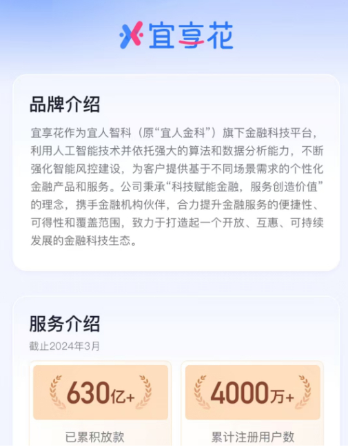 宜享花APP页面显示,截止2024年3月,已累积放款630亿+,累计注册用户数4000万+