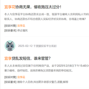 用户投诉:本人与宜享花平台协商还款未达成一致,现该平台催收人员利用私人号码发信息威胁要联系紧急联系人,协商还款也不结合借款人实际经济状况来协商,非得逼上绝境?