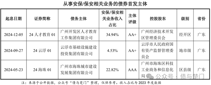 还有其他发债主体(非首发主体)从事安保/保安相关业务,如重庆发展投资有限公司、南通城市建设集团有限公司、汉江国有资本投资集团有限公司。安保/保安服务往往具有一定的区域性,产投企业可凭借地域优势,建立稳定的客户群和市场份额。