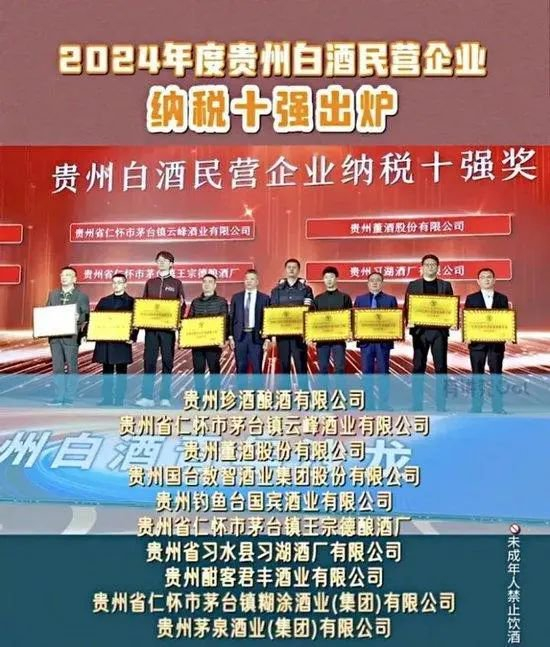 2月13日贵州省白酒企业商会发布“2024年度贵州白酒民营纳税十强”榜单,按顺序排名如下,贵州珍酒、茅台镇云峰酒业、贵州董酒、国台酒、钓鱼台、茅台镇王宗德酒、习水县习湖酒、酣客君丰、茅台镇糊涂酒业、茅泉酒业。