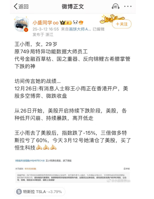 需要注意的是,这些描述可能带有夸张和娱乐成分,尤其是在社交媒体上。王小雨的真实身份和影响力需要更多的证据来验证。在金融市场上,个人的影响力通常不会像描述中那样直接和显著,市场波动受多种因素影响。因此,这些信息应谨慎对待,不宜完全采信。