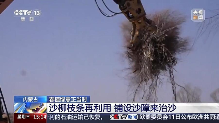 为了最大化利用沙柳枝条的生态功能,当地就地取材,降低治沙成本。平茬后的沙柳枝条经科学运输,就近用于沙障铺设或扦插治沙,既是治沙材料,又是经济资源。