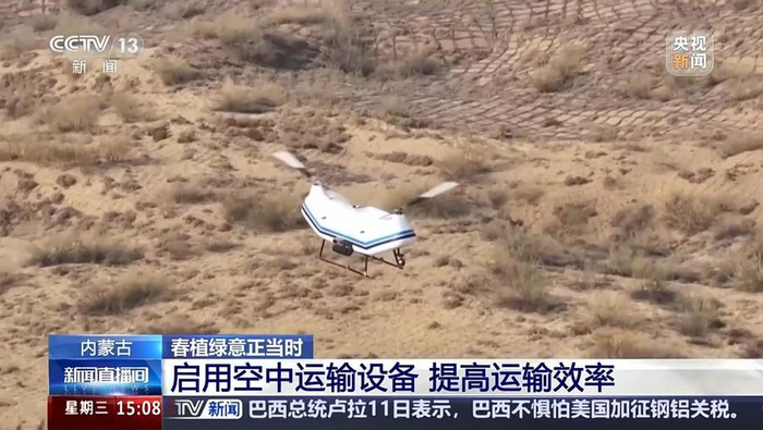 这架大型燃油无人机悬吊着稻草,飞至10公里外的治沙目标区域后,精准投放草料。这些空中运输设备的使用,不仅有效解决了治沙现场的运输难题,还提高了运输效率。