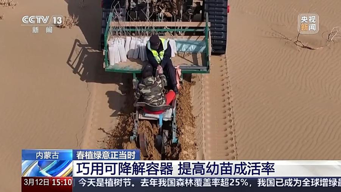 沙柳和柠条具有生长迅速、适应性强、耐旱等多种特点。为了进一步提高幼苗的成活率,当地巧妙运用了可降解容器种植技术,配合机械化植苗,即便三个月不下雨,幼苗也能在沙地中茁壮成长,提高了成活率。