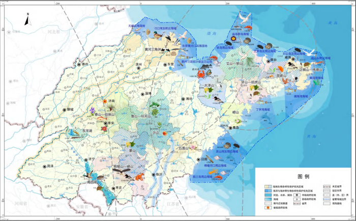 山东半岛陆海相拥、山川毓秀、平原广阔。(图/《山东省国土空间规划(2021-2035年)》中的生物多样性保护规划[10])