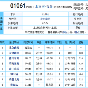 细看G1061次列车运行时刻表,你会发现,列车从北京到济南,相比从济南到青岛,停靠站点少、时间短。