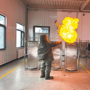 消防员穿上避火服,“全副武装”,拿着点燃的火把靠近氢气球,铝膜气球被烧漏后,气球皮落到地面上并持续燃烧。乳胶气球则发出“砰”的一声,瞬间变成一团红色的火焰。