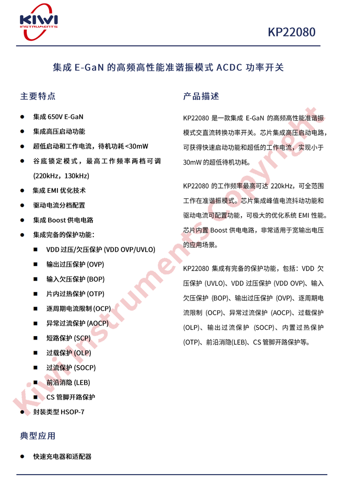 KP22080芯片具备130/220KHz两档工作频率可选,支持全范围准谐振运行。芯片集成峰值电流抖动功能和驱动电流配置,用于优化系统EMI性能。