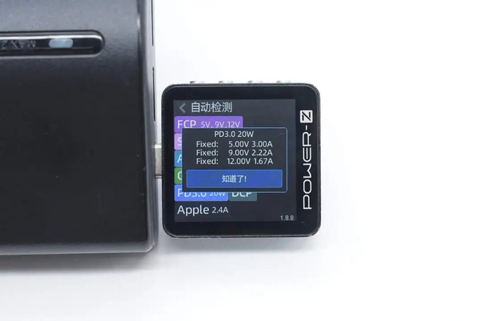 PDO报文显示USB-C口还具备5V3A、9V2.22A、12V1.67A三组固定电压档位。
