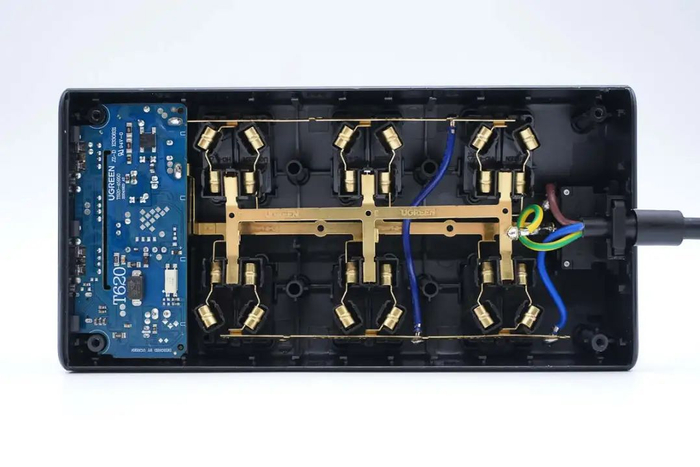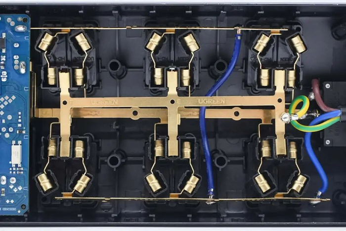内部AC插孔采用一体铜带设计,USB模块通过与铜带锡焊连接取电。