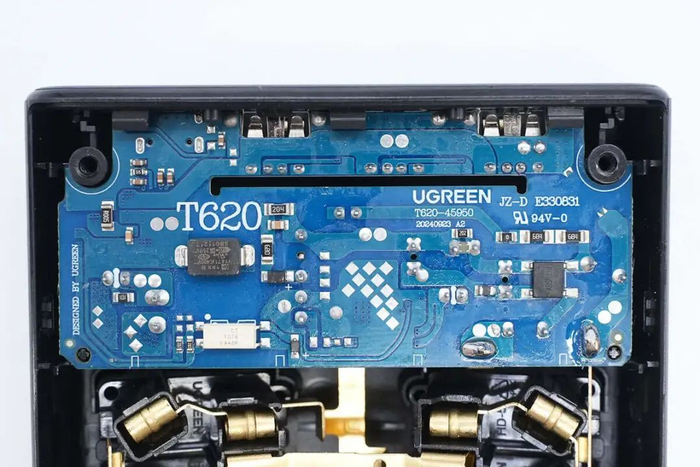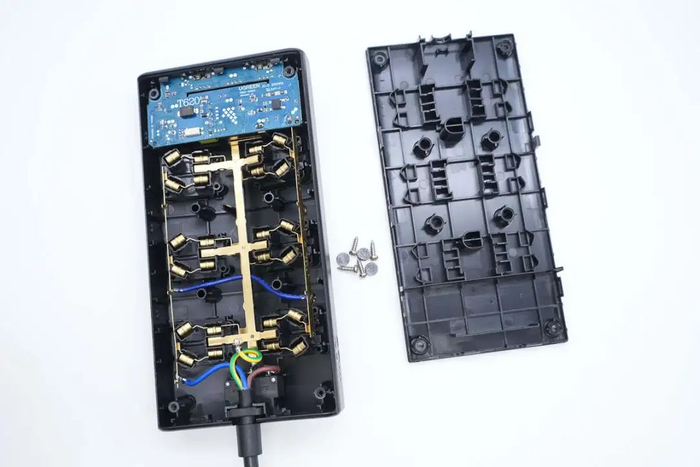 充电头网通过拆解发现,产品内部AC插孔采用一体铜带设计,连接导线锡焊牢固工艺可靠。USB模块采用了必易微KP22080+KP40661B高集成氮化镓电源方案设计,并使用了华源智信HYC5322协议芯片控制四口输出。板子上的电容、变压器等器件打胶加固处理,保证长久使用。