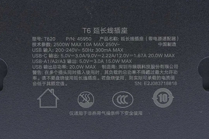 绿联T6斜面排插采用PC阻燃材质塑料外壳,安全可靠。同时两侧的AC孔位面做了15°斜面设计,既不拥挤还能让用户获得更好的插拔体验,细节创新很赞。