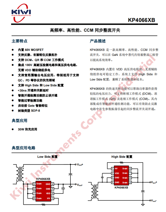 KP4066XB内置有VDD高压供电模块,无需辅助绕组供电可稳定工作,系统上支持High Side和Low Side配置,兼顾了系统性能和成本。