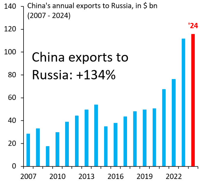 作为回报,俄罗斯也对中国商品出口做了很大的贡献(这还不包括通过出口中亚转运到俄罗斯的)——
