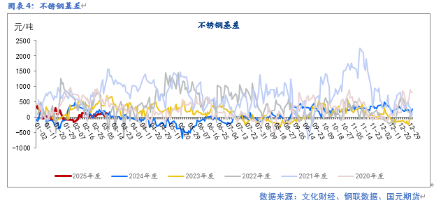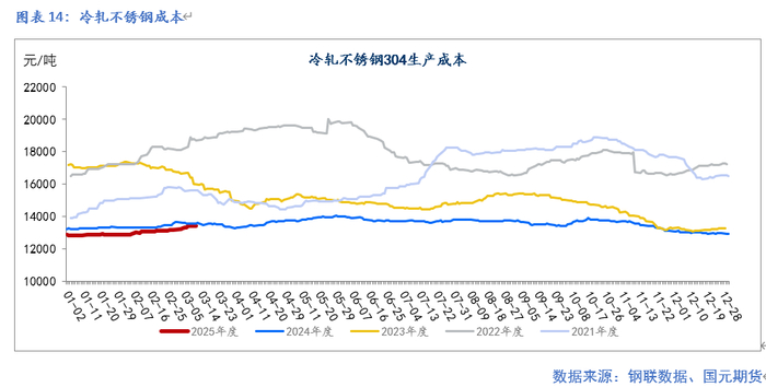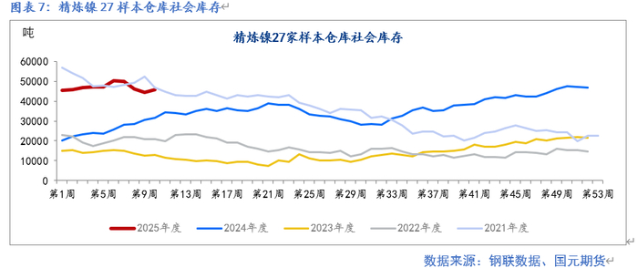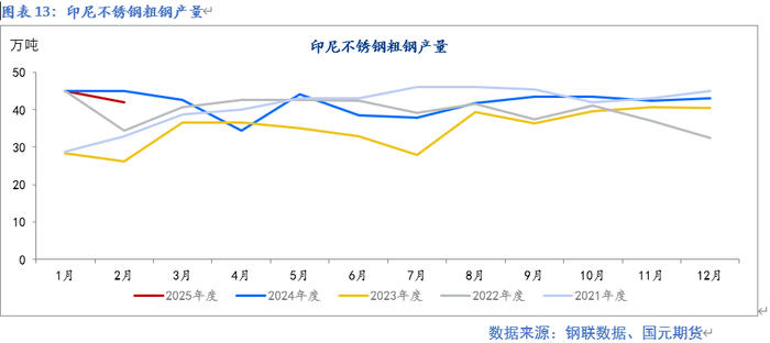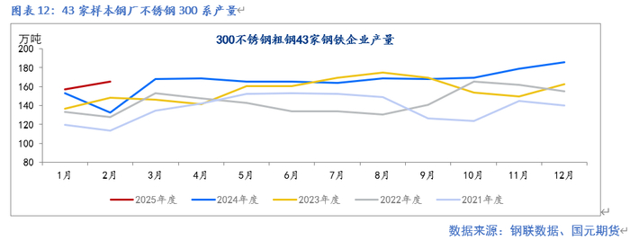 供应方面,排产回升。据Mysteel统计,2025年2月国内43家不锈钢厂粗钢产量314.53万吨,月环比增加28.38万吨,其中:200系91.88万吨,月环比增加14.83万吨;300系165.43万吨,月环比增加8.81万吨;400系57.22万吨,月环比增加4.74万吨。3月排产350.26万吨,其中:200系97.63万吨,月环比增加6.26%;300系190.14万吨,月环比增加14.94%;400系62.49万吨,月环比增加9.21%。