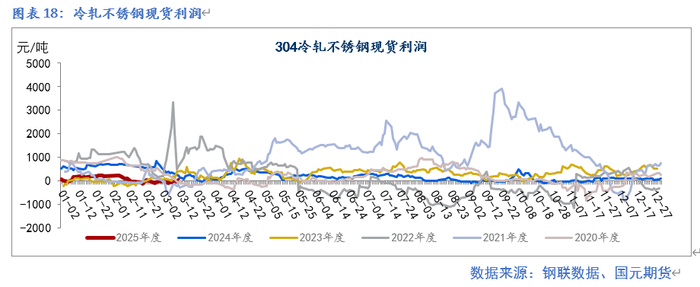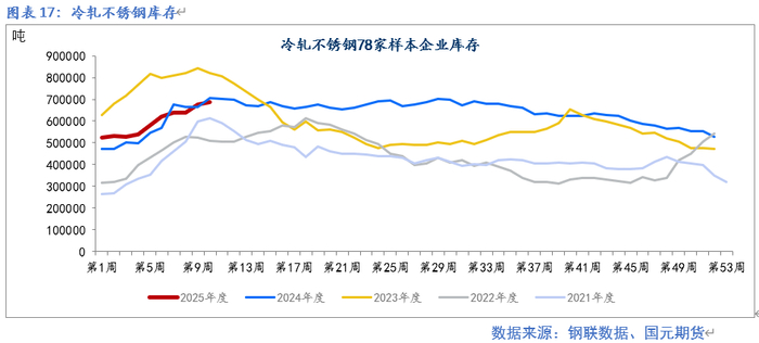 库存水平偏高,消化压力较大。截至3月6日,全国主流市场不锈钢89仓库口径社会总库存112.3万吨,周环比下降0.40%。其中冷轧不锈钢库存总量71.63万吨,周环比上升1.43%,热轧不锈钢库存总量40.66万吨,周环比下降3.46%。