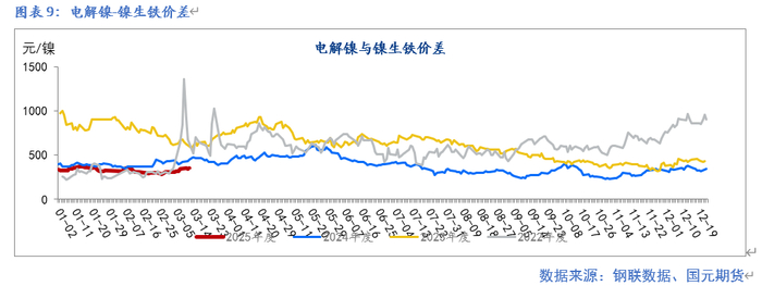 不锈钢排产增加,镍铁供需回升,价格上涨。2月国内主产区内蒙镍生铁金属产量为0.1168万吨,较上月末增加21.04%。低镍生铁企业开工率为76.35%,金属产量为0.6447万吨,较上月增加34.51%;高镍生铁企业开工率为49.89%,金属产量为1.6918万吨,较上月增加0.53%。截至03月11日,福建npi(7%≤Ni≤13%)到厂价格为990元/镍,较上月同期增加3.12%;江苏npi(7%≤Ni≤13%)到厂价格为1000元/镍,较上月同期增加3.63%。印尼主要港口至中国主要港口npi(13%>Ni>10%)FOB价格为119.0美元/镍,较上月同期增加4.39%。