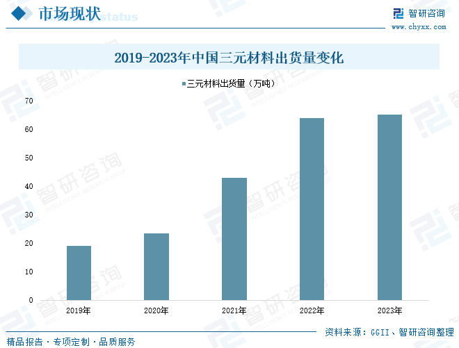 三元材料因其高能量密度、高电压平台以及良好的循环稳定性而广泛应用于现代电动汽车和便携式电子设备中。近年来,随着国内新能源汽车产业加速发展,我国三元材料应用需求量呈现日益增长态势,不断推动国内三元材料市场发展。数据显示,2023年我国三元材料出货量达到65万吨,同比增长2%。