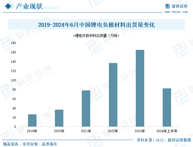 近年来,受益于国内外新能源汽车等终端市场增长拉动,我国锂电负极材料市场应用需求日益旺盛,国产锂电负极材料生产企业纷纷提高生产能力,扩大生产规模,促使我国锂电负极材料市场出货量保持稳步提升。2023年我国负极材料出货量达165万吨,同比增长21%;其中人造石墨、天然石墨材料出货分别为146万吨、18万吨。2024年上半年,全国负极材料出货量达82万吨,同比增幅达16%以上。目前国内锂电负极材料行业出货规模排名靠前的企业有贝特瑞、杉杉股份、璞泰来、凯金能源、中科电气等,国产锂电负极材料供应能力不断增强,为国内锂电池生产提供强有力支撑。