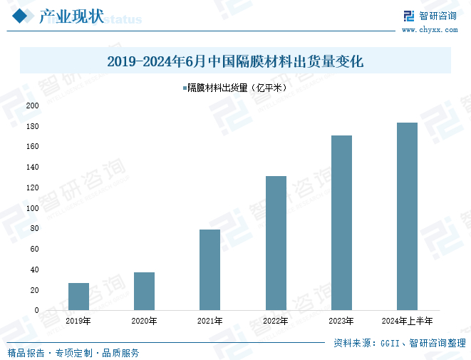 近年来,随着新能源、新能源汽车、储能等新兴产业加速发展扩容,锂电池逐渐成为市场投资关注重点产业,而隔膜作为产业主要细分市场之一,恩捷股份、星源材质、璞泰来等国产资本不断增加产能投资,我国隔膜生产供应能力得以不断提高,全国隔膜出货量呈现大幅增长态势。数据显示,2023年我国隔膜材料出货总量达171亿平米,同比增长率高达31%;其中干法隔膜材料出货量为47亿平米,湿法隔膜材料出货量为124亿平米。2024年上半年,国内隔膜材料出货量达183亿平米,同比增幅达16%以上。