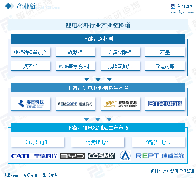 锂电材料行业产业链上游为原材料供应商,包括矿资源、碳酸锂、六氟磷酸锂、石墨材料、聚乙烯、聚丙烯、涂覆材料、添加剂等;中游为锂电材料生产制造商,包括正极材料、负极材料、隔膜、铝塑膜、铝箔、铜箔、电解液等;下游为锂电材料应用市场,即锂电池制造生产行业,可细分为动力锂电池、储能锂电池、消费锂电池等。