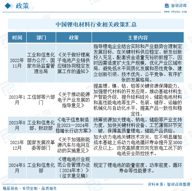 锂电材料是锂电池技术的核心,随着科技的不断进步和市场的不断发展,锂电材料也在不断创新和优化,以满足不同领域的需求。近年来,国家通过制定和实施《锂电池行业规范条件(2024年本)》《锂电池行业规范公告管理办法(2024年本)》《电子信息制造业2023—2024年稳增长行动方案》等一系列政策来规范锂电材料行业的发展秩序,推动行业健康、有序发展。
