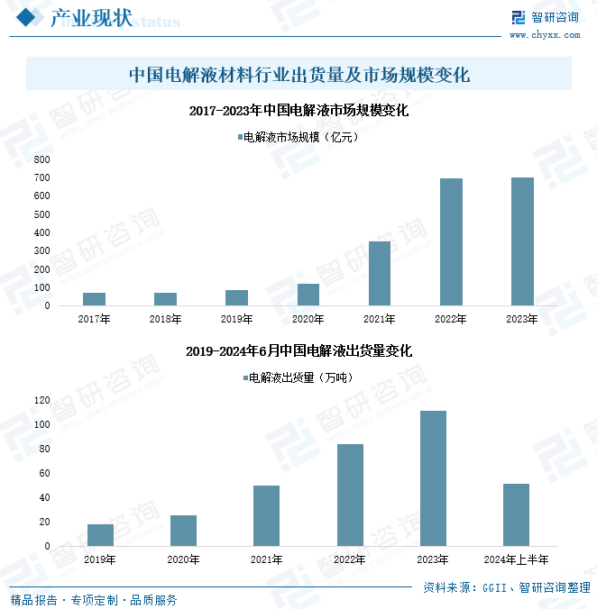 电解液在锂电池正、负极之间起到传导离子的作用,是锂离子电池获得高电压、高比能等优点的保证。近年来,电解液下游应用不断丰富,在新能源汽车、电网储能、家庭光储系统等都有着较大的成长空间,国内电解液应用需求保持高速增长,行业规模呈现持续扩容态势。据统计,2023年,我国电解液材料出货量达111万吨,同比增长率高达31.5%;全国电解液市场规模已从2017年72亿元增长至701.5亿元。2024年上半年,全国电解液材料出货量达51万吨,同比增幅达16%以上,2024年国内电解液市场规模有望进一步扩容至800亿元。