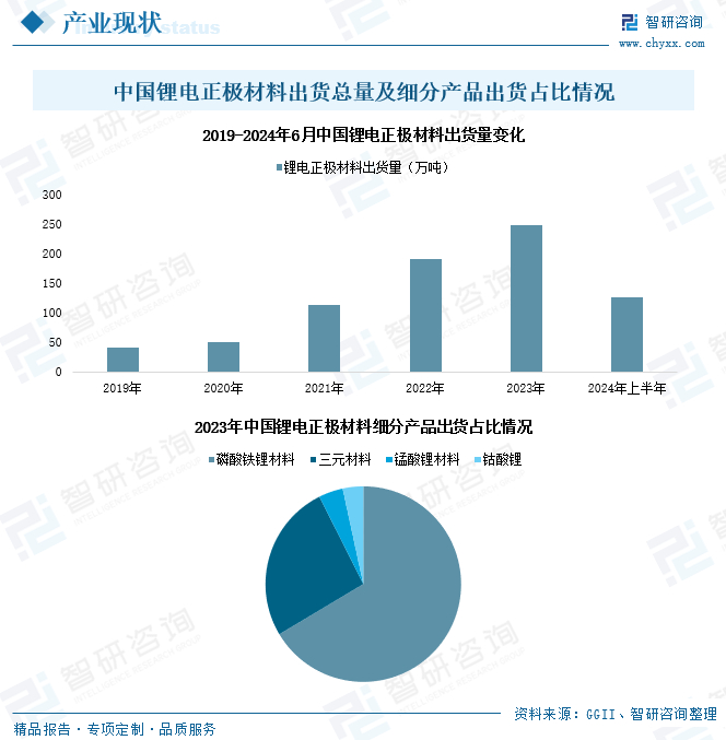 正极材料是电池材料中规模最大、产值最高的环节,对电池的能量密度及安全性能具有主导作用。近年来,得益于新能源汽车的发展,我国锂电池正极材料出货量快速增长。2023年我国正极材料出货量达248万吨,同比增长31%;2024年上半年,国内正极材料出货量达126万吨,同比增幅达16%以上。