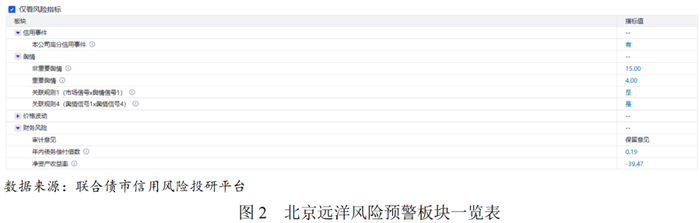 根据联合债市信用风险投研平台(https://ic.lhratings.cn/login)显示,北京远洋风险程度1自2022年4月11日起由绿色预警上升为红色预警,较公司实质违约提前650天,较公司债券展期2提前了508天。2022年4月11日,联合预警模型捕捉到了公司的价格波动、舆情信号,经过模型推算预测发出红色预警;2022年9月12日,模型捕捉到财务风险信号;2023年1月16号,模型捕捉到信用事件信号,公司风险评分大幅上升,此后一直处于红色预警区间,直至进入黑色预警区间。外部评级自2015年7月7日起,维持AAA评级未发生变化。