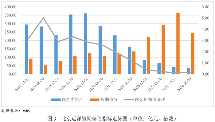 近年来,房地产行业受政策调控及市场需求波动影响显著。在房地产行业整体波动的大环境下,公司面临着较为严峻的财务风险。从违约前偿债指标来看,现金类资产余额从2020年底开始持续下降,短期债务却保持增长趋势,现金类资产对短期债务的覆盖程度逐渐不足,现金类资产/短期债务比例自2020年下半年以来不断下滑。