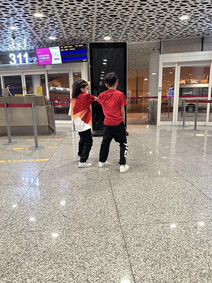宋皓铭(左)与符隽熙在机场练习街舞。