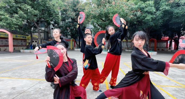 符隽熙(中)与老师、同学在学校内排练舞蹈。