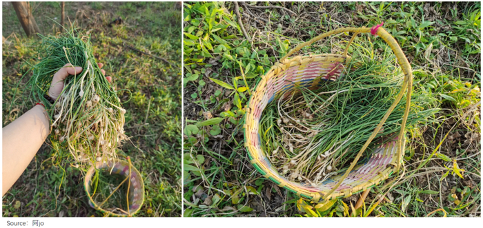阿jo的父母一开始不理解她为什么要驱车30公里跑去郊区挖野菜,直到吃了一顿她做的野葱炒蛋,立马“真香”了。