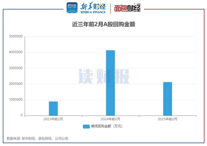 3月12日,新华财经和面包财经研究员梳理信披数据显示,2025年前2月A股共有571家上市公司实施回购。其中,贵州茅台(600519.SH)前2月回购金额达到12亿元,位居首位。