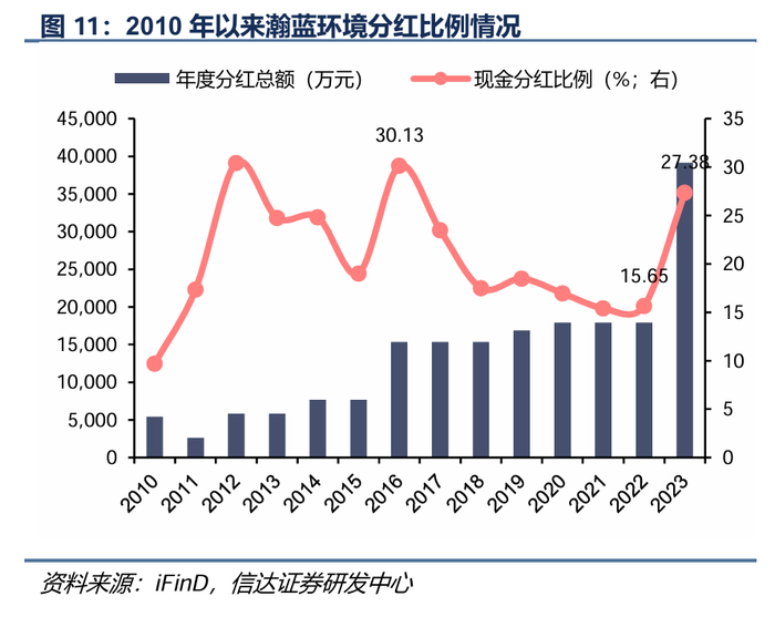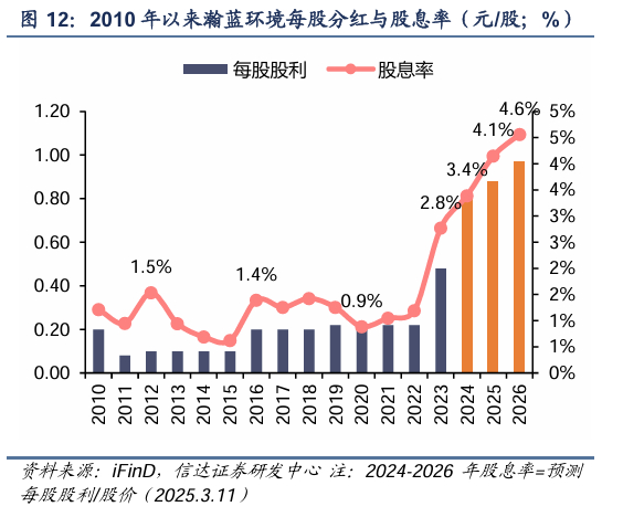 2024年每股分红同比增长67%,未来预计股息率有望超过4%。2024年7月,瀚蓝环境发布2024-2026年分红规划,公司未来三年(2024-2026年度),每股派发的现金股利较上一年度同比增长不低于10%。2025年2月8日,公司发布《2024年度利润分配预案》,拟派发现金红利0.8元/股(含税),同比提高66.7%,大幅超过分红承诺。以此测算2024年静态股息率为3.4%,若后两年每股分红按承诺最低水平即每年10%增长,按3.11日股价进行计算,2025-2026年公司股息率为4.1%、4.6%。