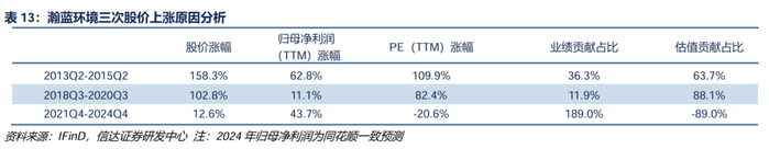 2013-2015年,涨估值+涨业绩。2014年公司收购创冠环保100%股权,实现了业务布局从佛山市南海区面向全国的发展,固废业务扩张到全国多个省市,垃圾焚烧发电规模从 3000 吨/日增加到 14350 吨/日。叠加2015年牛市行情,公司2015年中股价较2013年中股价上涨158.3%,其中业绩增长贡献36.3%、估值上涨贡献63.7%,PE最高达到55x。2015H1后估值逐步回落至15x-20x。