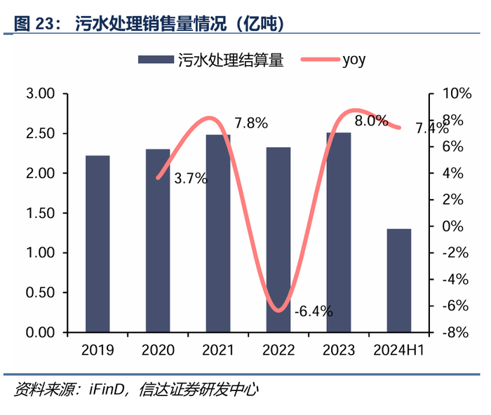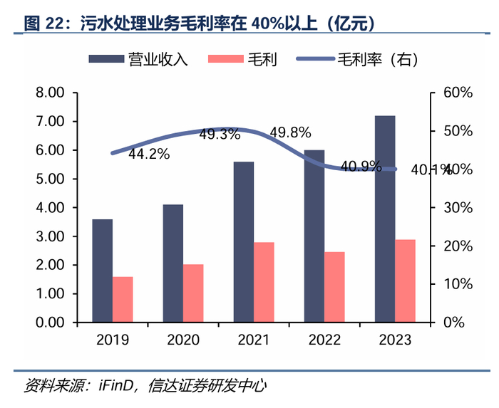 在运污水处理规模约81万吨/日,毛利率稳定在40%。截至2023年底,公司生活污水处理规模80.8万吨/日,在南海区的市场占有率达70%以上。另有工业废水处理规模2万吨/日,采用市场化经营模式。2019-2023年污水处理厂陆续投产,板块营业收入复合增长率为19%,污水销售量复合增长率为3.1%,2023年,污水处理产能进入稳定期,板块收入贡献占比为5.7%,毛利率稳定在40%以上。