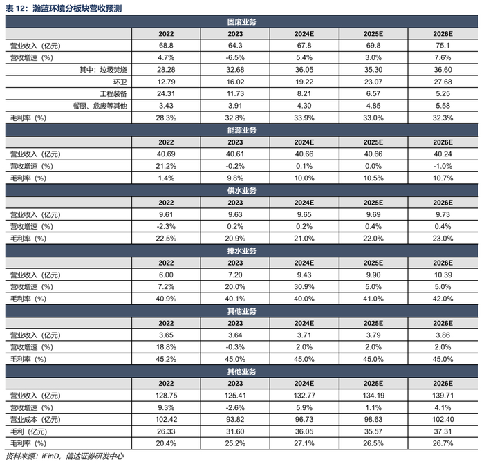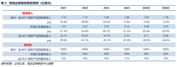 (2)环境卫生服务收入:2022-2024年板块营收增速为36%、51%、21%,我们保守假设2024-2026年每年收入增速为20%。我们预测毛利率与2024年39%毛利率水平保持一致。
