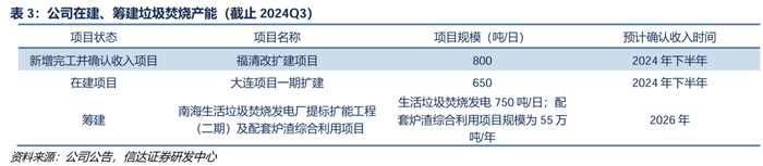 对外收购助力产能规模扩张,在运垃圾焚烧规模约3.1万吨/日。2006年,瀚蓝环境收购南海环保电厂一期,开展垃圾焚烧业务;2014年收购创冠中国100%股权,垃圾处理产能由3000吨/日提升至近14350吨/日,并实现业务全国布局;2019年公司承接盛运环保垃圾焚烧发电资产,产能迈入30000吨/日大关。截至2024Q3,公司在手垃圾焚烧项目规模35750吨/日,在运30600吨/日,在建项目规模650吨/日,筹建项目规模750吨/日,未建项目规模3750吨/日。根据已披露的投产进度,我们预计2026年垃圾焚烧产能有望达到3.2万吨/日。