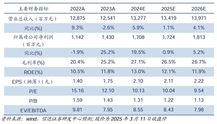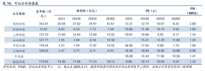 对比公司历史数据,当前估值处在低位。截至2025年3月11日,瀚蓝环境PE-TTM为10.49x,处在近十年13.7%分位数上;瀚蓝环境PB-MRQ为1.32x,处在近十年13.5%分位数。我们预测瀚蓝环境2024-2026年PE分别为10.13x/10.04x/9.54x,低于行业可比公司PE平均值14.42x、11.9x、10.56x。