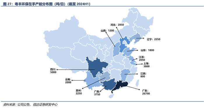 粤丰环保垃圾焚烧业务扎根广东、布局全国,是广东最大民营垃圾发电企业。截至2024H1,公司在手垃圾焚烧发电项目36个,产能54540吨/日,其中33个项目已投入运营,在运产能43690吨/日(占比80%)。公司业务覆盖全国12个省份,其中广东地区产能占比接近50%,此外在四川、广西、上海等地均有布局,产能占比约为9.2%、6.9%、7%。