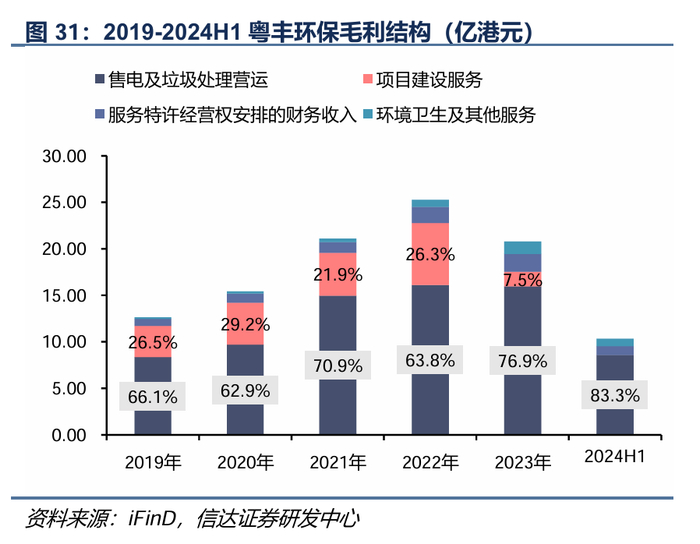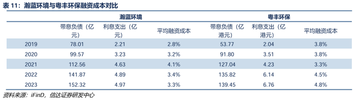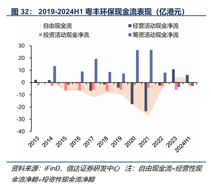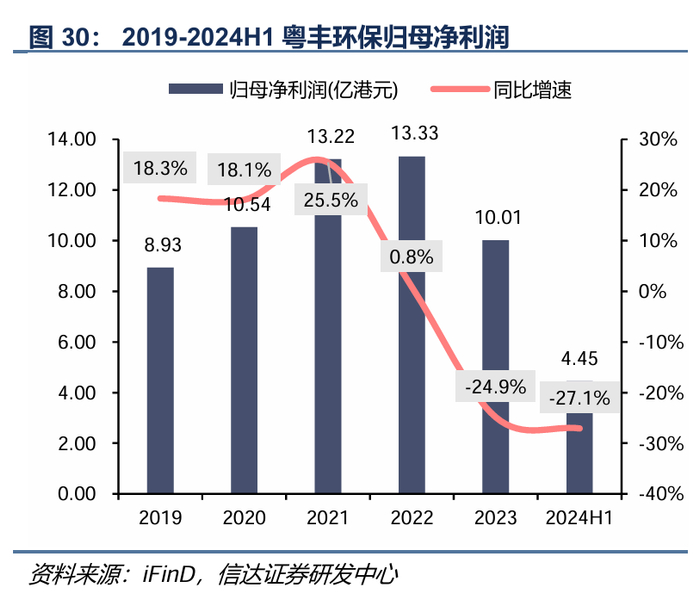 (2)财务成本降低。粤丰环保融资成本整体高于瀚蓝环境,2023年粤丰环保平均融资成本约为4.8%,而瀚蓝环境则约为3.3%。若成功整合,瀚蓝环境可充分发挥国企资源优势,进一步提高标的公司的融资能力,降低其财务成本。按粤丰环保2024H1有息负债金额139.22亿港元计算,假设收购后粤丰环保融资成本由4.8%降低至3.3%,一年将节省利息2.21亿港元。
