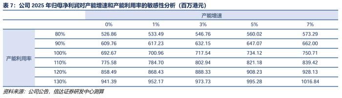 产能规模:截至2024年底,粤丰环保在手产能为54540吨/日,在建及规划项目11625吨/日。由于行业发展进入成熟期,新增项目规模有限,因此假设公司未来三年在手产能无新增,在运产能增加来自新建投产;产能利用率:公司2020年以来产能利用率逐渐提升,按一年350天假设,公司2020年-2024H1产能利用率为88.8%、89.8%、95.4%、108.7%、114.4%,因此假设2025-2027年产能维持高位水平。我们对产能增速与产能利用率进行敏感性分析并选取中性假设,即2024-2026年公司每年产能增速为1%,产能利用率保持115%,公司2025年归母净利润为8.27亿港元。