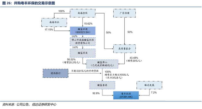 瀚蓝计划以不超过113亿元港币现金收购粤丰环保。2024年11月21日,瀚蓝环境发布的《重大资产购买报告书》,公司拟批准瀚蓝香港作为要约人,对粤丰环保实施私有化。公司全资子公司瀚蓝固废与联合投资人高质量发展基金共同向瀚蓝佛山合计增资40.2亿元。其中,高质量发展基金由母公司南海控股和广东恒健合资成立,出资为了支持广东省企业转型升级。增资完成后,瀚蓝环境持股瀚蓝佛山56.52%股权、高质量发展基金持股43.48%。同时,瀚蓝佛山拟向境内银行申请不超过人民币61亿元的并购贷款。获得上述增资款和并购贷款后,瀚蓝佛山拟向其境外全资子公司瀚蓝香港增资至总股本不超过113亿元港币(或人民币105亿元),用于支付本次私有化交易对价。交易完成后,瀚蓝环境拟持有粤丰环保股权52.45%。截至2025年1月17日,已完成向瀚蓝佛山的46亿元注资。