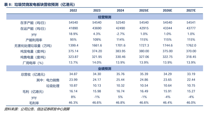 合并后瀚蓝环境拟持有粤丰环保52.45%股权。我们预计粤丰环保2025-2027年营业收入为42.3亿港元、42.1亿港元、42.14亿港元,增速分别为0.8%、-0.5%、0.1%;归母净利润为8.27亿港元、8.45亿港元、8.65亿港元(合人民币7.69亿元、7.86亿元、8.05亿元)。