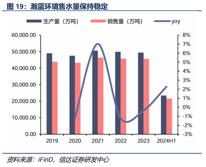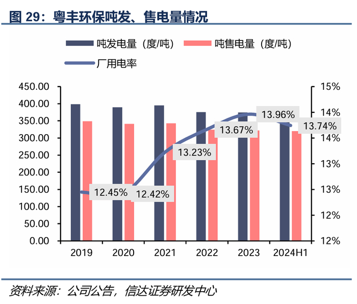 公司精细化管理提高运营管理效率。公司产能利用率持续保持高位,我们按照一年运营350天测算,除2019-2021年在建项目大量投产,产能爬坡期产能利用率略有下滑之外,公司基本处于产能达满状态,2024H1产能利用率超过110%。同时公司厂用电率13.74%,低于行业15%-20%的平均水平。